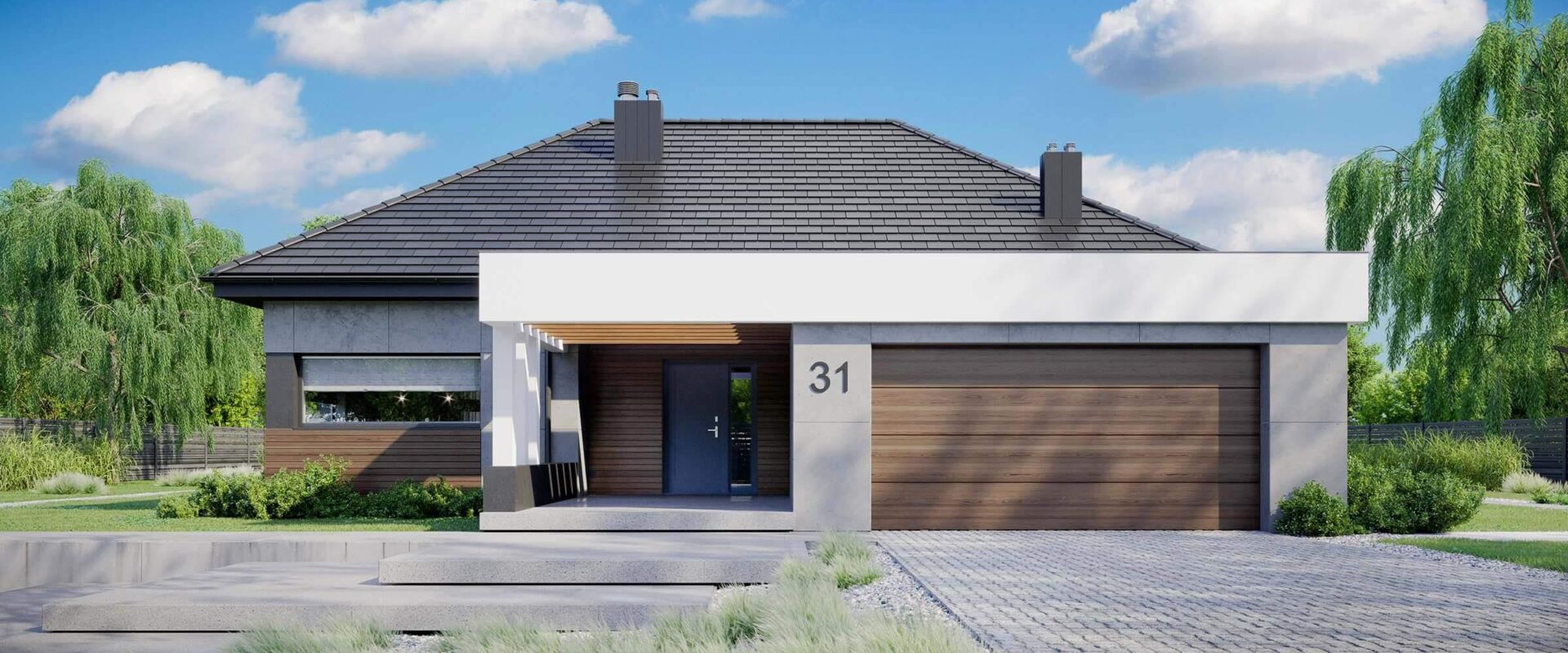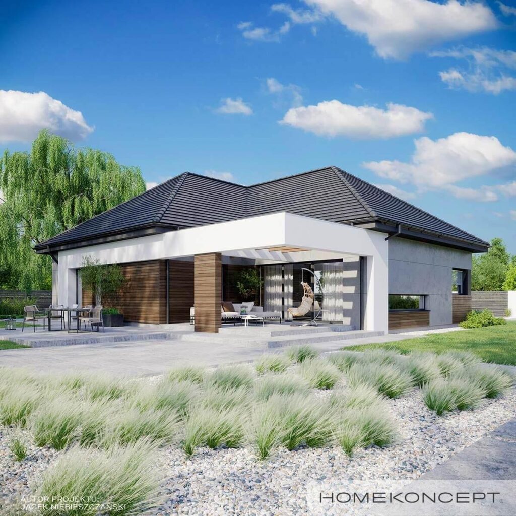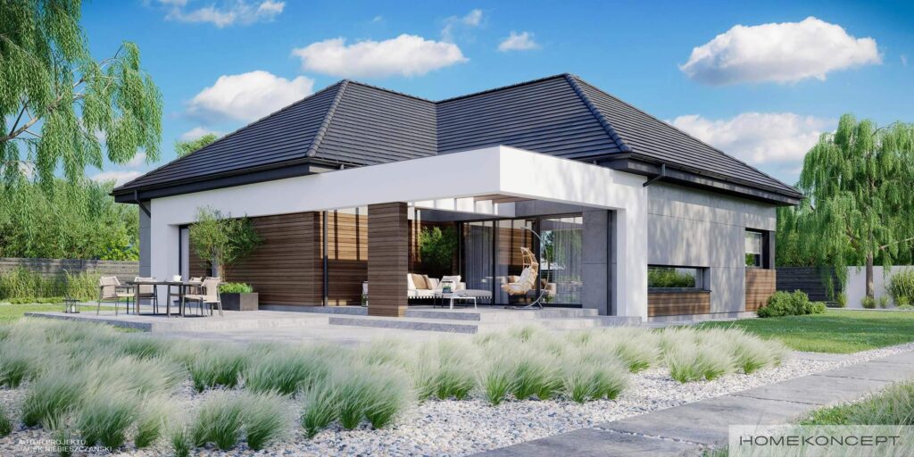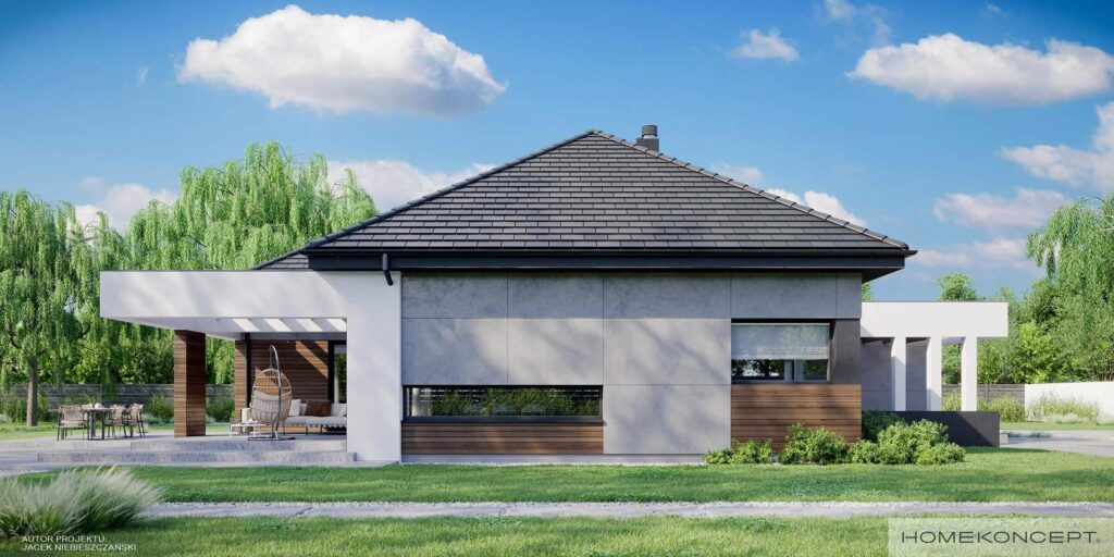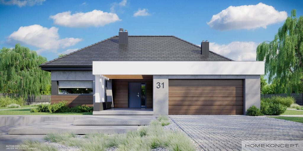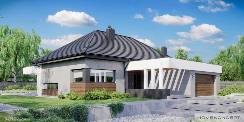 HOMEKONCEPT 31 jest pomniejszonym wariantem naszego urzekającego domu parterowego HOMEKONCEPT 26. Szczególną uwagę zwraca przestronny taras i przepiękna elewacja domu skomponowana z połączenia płyt betonowych z wysokogatunkowym drewnem oraz zastosowanym białym belkowaniem wokół domu. Nie sposób jest przejść obojętnie obok okazałego wejścia do domu, subtelnie skrytego pod drewnianym belkowaniem.